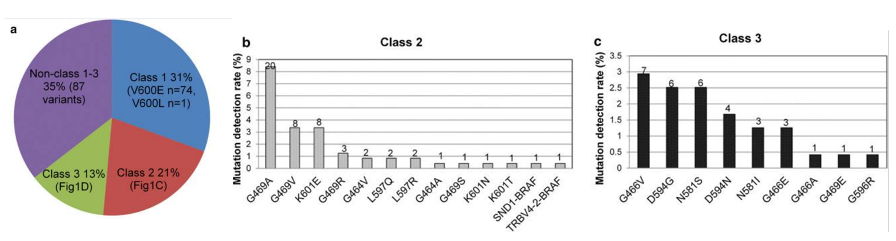 根據(jù)BRAF變異信號(hào)傳導(dǎo)機(jī)制和激酶活性,可將其分為三種功能類(lèi)別:不依賴(lài)RAS,BRAF 激酶活性強(qiáng),比如V600E/L等(1 類(lèi));不依賴(lài) RAS,但靠二聚體形式激活通路,激酶活性比野生型高,比如G469A、K601E等(2類(lèi));以及依賴(lài)RAS ,激酶失活的異二聚體變異(3 類(lèi))[4]。